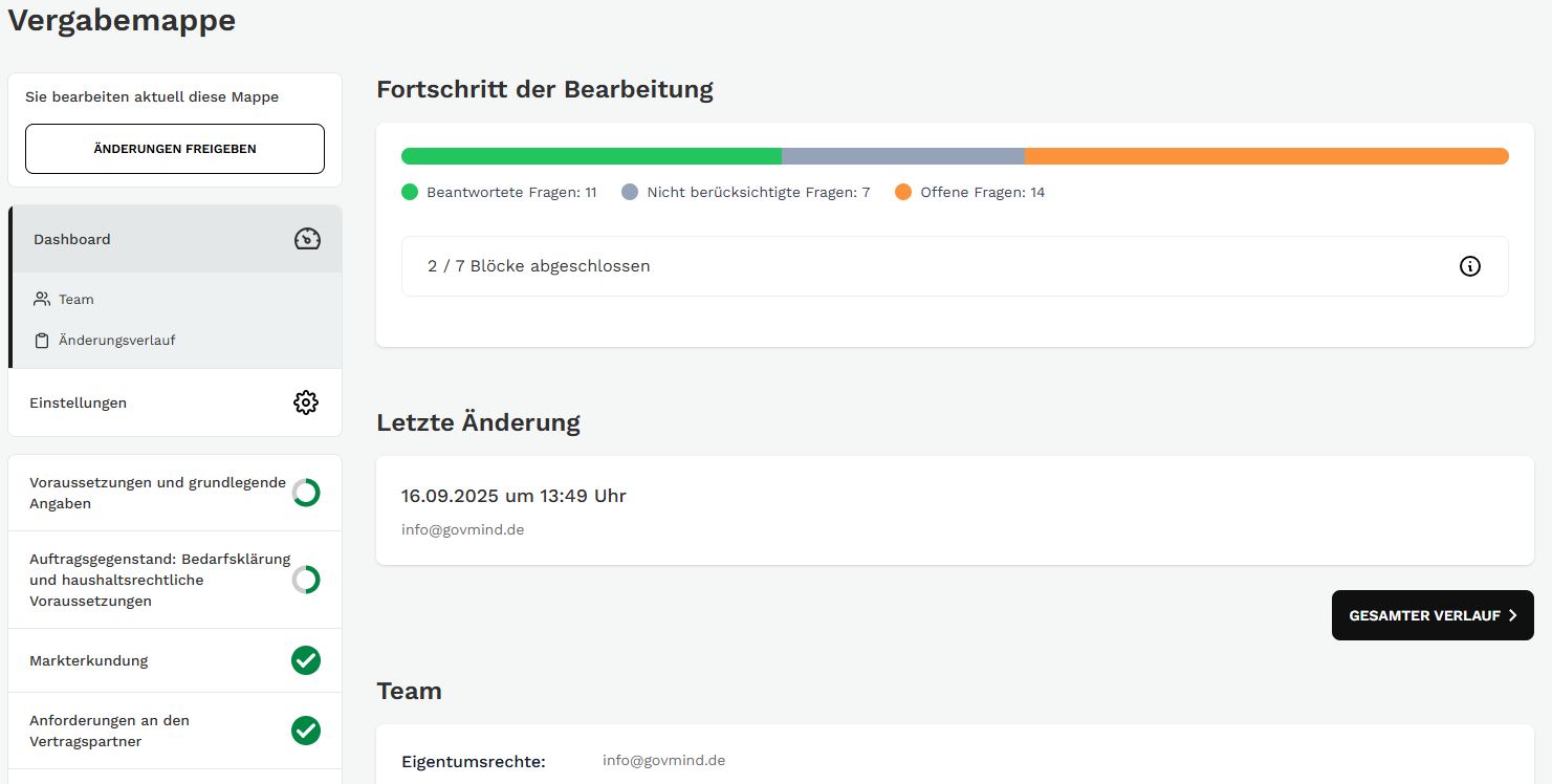 Mit GovMind bereiten Sie Ihre Beschaffungen optimal vor. Assistentengestützt tragen Sie bedarfsorientiert alle notwendigen Informationen für den späteren Einkauf oder die Vergabe zusammen, dokumentieren diese nachweisbar und bereiten sie für die Weitergabe an die durchführende Instanz vor (z.B. als PDF oder als digitale Bedarfsmeldung an ein VMS).